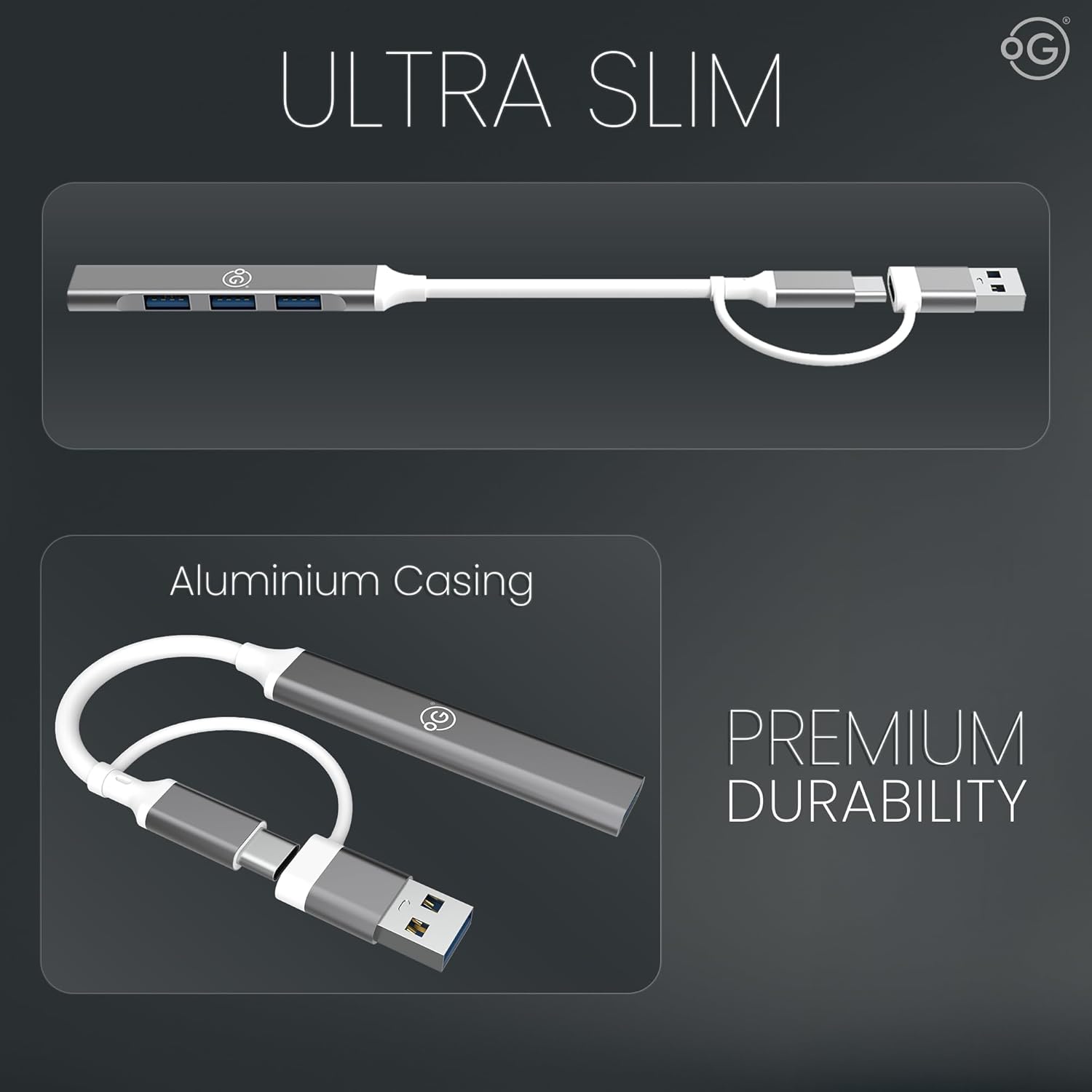 OOGE Fuse 100 USB Hub – 4-Port USB 3.0 High-Speed Splitter with Dual USB-A & USB-C Connectors, Flash Pulse Technology, Plug & Play, Compact Design for Laptops, Desktops, Tablets, and More